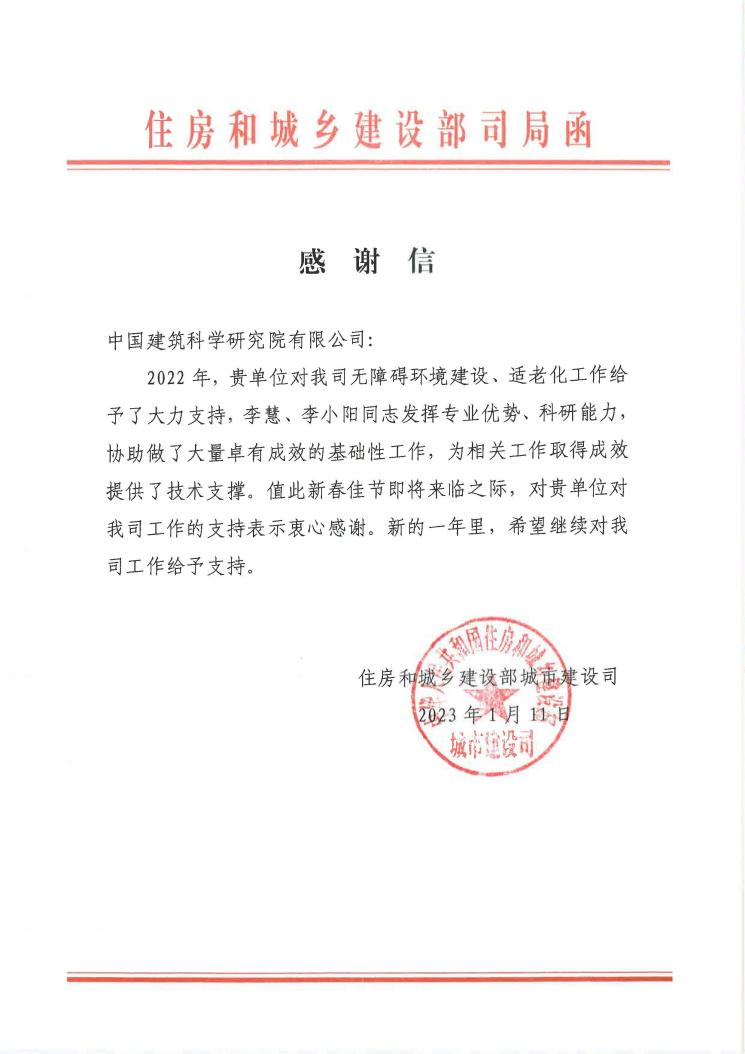 春節(jié)前夕,中國(guó)建研院收到住房和城鄉(xiāng)建設(shè)部城市建設(shè)司發(fā)來(lái)的感謝信,對(duì)中國(guó)建研院在無(wú)障礙環(huán)境建設(shè)、適老化工作給予的大力支持,及有關(guān)同志發(fā)揮專業(yè)優(yōu)勢(shì)、科研能力和取得的成效上給予肯定并表示感謝,同時(shí)希望新的一年里對(duì)住建部城建司工作繼續(xù)給予支持。