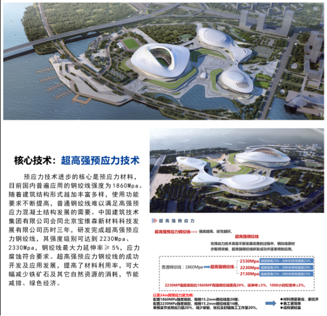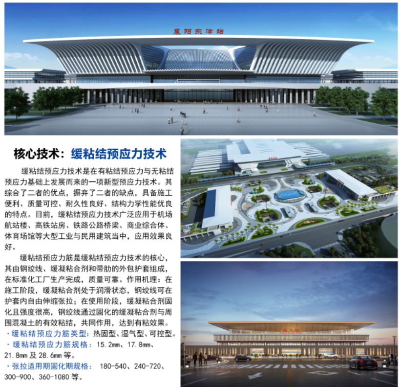 在我國鐵路、航空、公路等交通行業(yè)事業(yè)蓬勃發(fā)展的進程中,中技集團作出了積極貢獻,一是積極參與40余座高鐵客站建設(shè),如北京豐臺南站、北京朝陽站、北京副中心站、北京大興站,“一帶一路”中緬鐵路緬甸萬象站,川藏鐵路澤當站、林芝站,中國第四代鐵路客站杭州西站、廣州白云站等,樹立了“中技預應(yīng)力”優(yōu)質(zhì)品牌。二是高度重視預應(yīng)力技術(shù)標準的升級,先后編制發(fā)布或在編多部預應(yīng)力相關(guān)標準,如《大直徑緩粘結(jié)預應(yīng)力鋼絞線》、《濕氣型緩粘結(jié)預應(yīng)力鋼絞線》、《濕氣型緩粘結(jié)預應(yīng)力鋼絞線專用粘合劑》、《公路橋梁緩粘結(jié)預應(yīng)力混凝土結(jié)構(gòu)技術(shù)指南》、《緩粘結(jié)預應(yīng)力錨桿錨樁技術(shù)規(guī)程》、《超高強預應(yīng)力鋼絞線》等。三是高效推進預應(yīng)力科研成果轉(zhuǎn)化,創(chuàng)造了多個“國內(nèi)首個”,先后實施了國內(nèi)首個大直徑緩粘結(jié)預應(yīng)力技術(shù)應(yīng)用項目(高鐵安順西站站前廣場,2016年),國內(nèi)首個濕氣型緩粘結(jié)預應(yīng)力技術(shù)應(yīng)用項目(阜陽西站站前廣場,2018年),國內(nèi)首個緩粘結(jié)預應(yīng)力錨桿技術(shù)應(yīng)用項目(南海體育中心,2020年),國內(nèi)首個緩粘結(jié)預應(yīng)力抗浮樁技術(shù)應(yīng)用項目(化龍安置區(qū)工程,2020年),國內(nèi)首個超高強預應(yīng)力技術(shù)應(yīng)用項目(廈門新體育中心,2021年)。