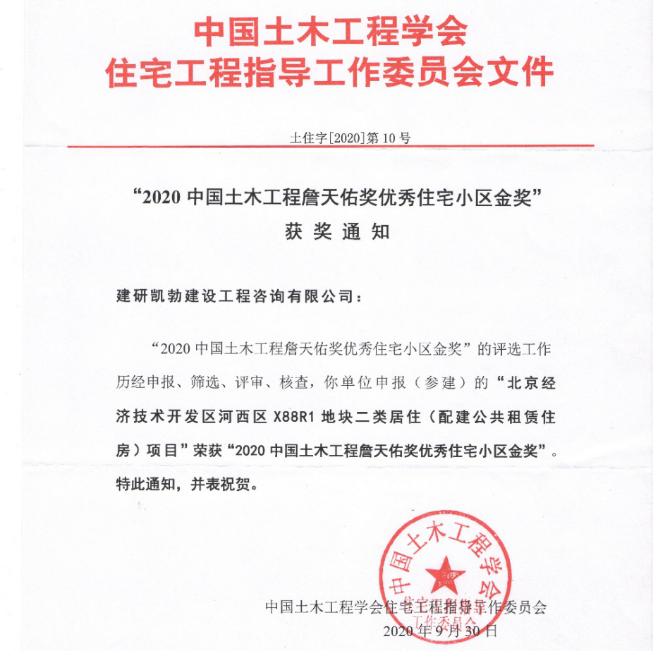近日,建研凱勃建設(shè)工程咨詢有限公司(以下簡稱“建研凱勃”)監(jiān)理的北京經(jīng)濟(jì)技術(shù)開發(fā)區(qū)河西區(qū)X88R1地塊二類居住(配建公共租賃住房)項(xiàng)目榮獲2020中國土木工程詹天佑獎(jiǎng)優(yōu)秀住宅小區(qū)金獎(jiǎng),這是繼該項(xiàng)目獲得北京市結(jié)構(gòu)長城杯金質(zhì)獎(jiǎng)后的又一重大獎(jiǎng)項(xiàng)。