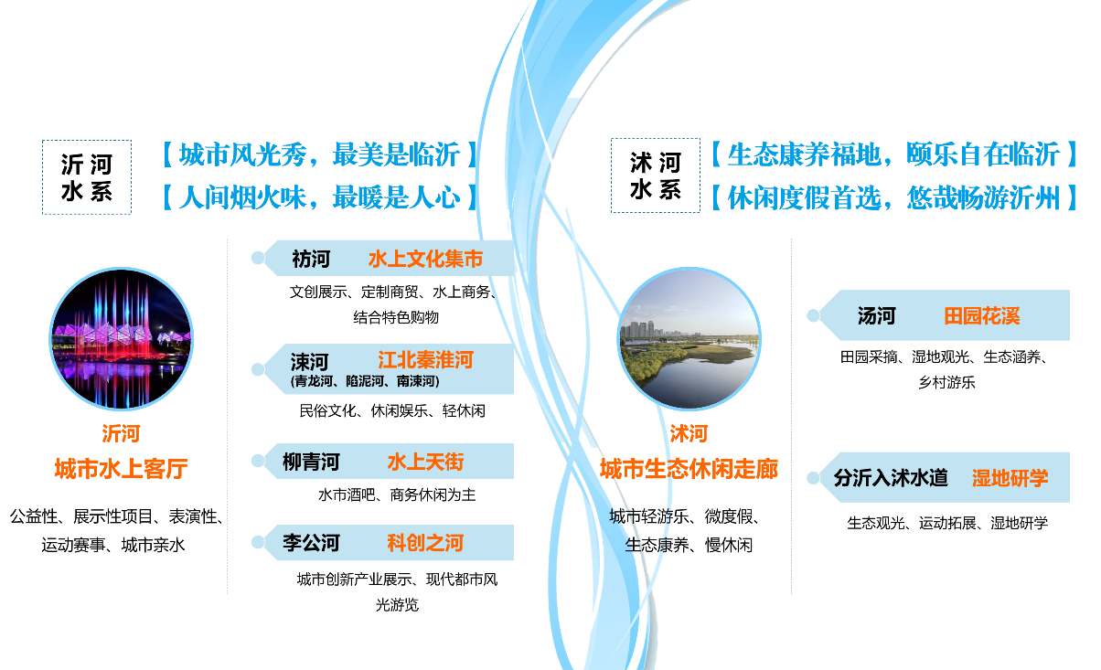 2.“水+旅游”專題——從“河流振興、因水而親、城鄉(xiāng)共榮”的角度出發(fā),通過對主要水系河流進行發(fā)展定位,完善河流旅游產品和項目業(yè)態(tài),以主題游線設計、沂水夜游、其他特色項目等為吸引點,優(yōu)化提升臨沂市水上旅游品質,樹立臨沂北方水城的品牌形象與市場競爭力。