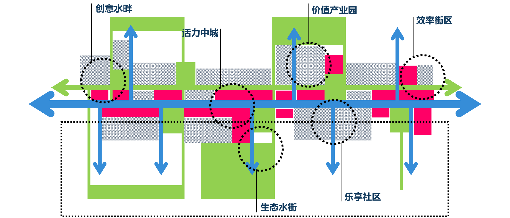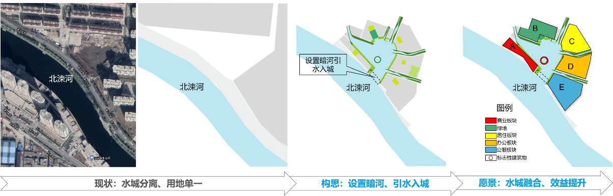 1.“水+城”專題——通過研究水系與外圍城市、城市各板塊、臨沂老城區(qū)、國際生態(tài)城等各個城市層級的關系,明確水城互動的聯(lián)系要素,提出“增加城市與水的接駁”、“引水入城”等發(fā)展策略,以此解決水城空間割裂、濱水可達性差、濱水用地效益低等現(xiàn)狀問題。