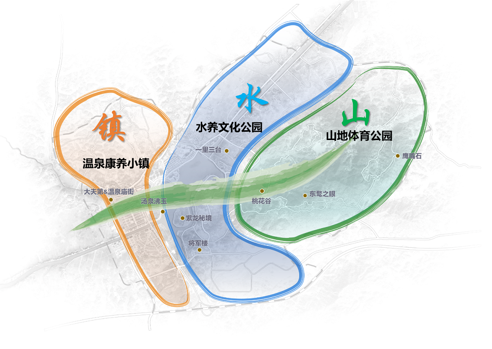 規(guī)劃形成“兩公園一小鎮(zhèn)、八景點一通廊”的空間結(jié)構(gòu),以紫龍湖為核心打造溫泉康養(yǎng)文化公園;結(jié)合東鶩山打造山地體育公園;結(jié)合灰湯鎮(zhèn)區(qū)打造灰湯溫泉民俗小鎮(zhèn);打“湯泉沸玉、鷹嘴石、桃花谷、將軍樓、大夫第&溫泉廟街、一里三臺、東鶩之眼、紫龍秘境”灰湯八景;依托烏江、紫龍湖、東鶩山形成山水景觀視線通廊。
