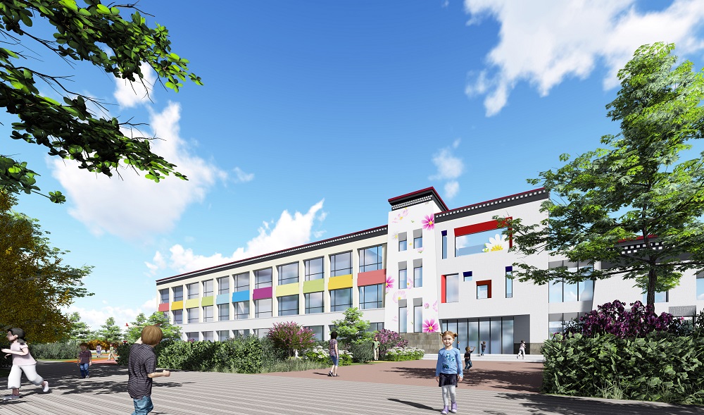 幼兒園建設響應國家相關政策,為幼兒提供獨具特色空間的環(huán)境,堅持美觀的同時,又能滿足使用功能的合理性。整體設計以現代簡潔的處理手法,在充分考慮經濟及美觀性的前提下,體現藏區(qū)建筑特色。立面采用虛實結合的處理手法,以橫向線條體聯(lián)系建筑各個部分,強調活動單元體量,創(chuàng)造富有秩序的立面節(jié)奏,通過明確的進退關系區(qū)分各功能區(qū)塊的轉換,塑造強烈的光影變化,為孩子提供自由靈活的生活活動場所。