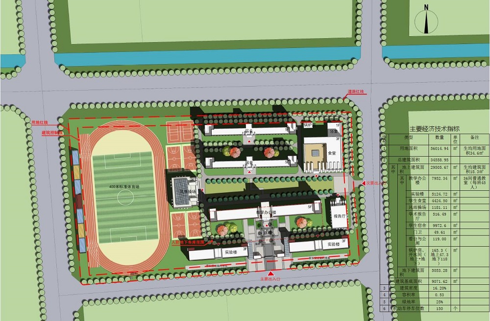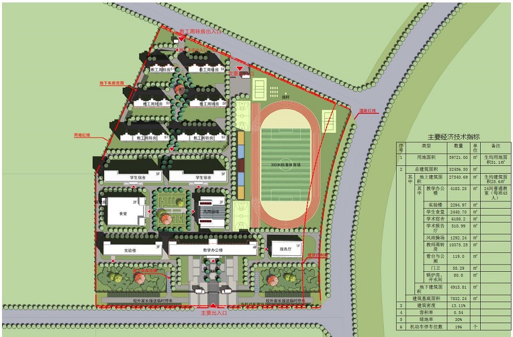 ???本項目用地位于日喀則市經濟開發(fā)區(qū),辦學規(guī)模為24班的小學,包括教學樓、實驗樓、食堂、風雨操場、宿舍樓等建筑。規(guī)劃建設用地為59721㎡,建筑總面積為32456.5㎡,其中地上建筑面積27540.69㎡,地下建筑面積4915.81㎡。建筑密度13.11%,容積率0.54,綠地率30%,機動車停車位數196個。南側、東側、北側為規(guī)劃道路,西側緊鄰規(guī)劃曲布幼兒園和園丁苑。