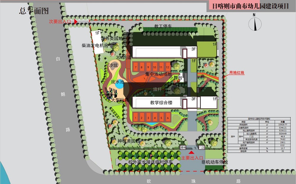 ????本項目位于日喀則珠峰開發(fā)開放試驗區(qū)教育城內,規(guī)劃為12班幼兒園,建設用地為15920.77㎡,建筑總面積為5346.21㎡,其中地上建筑面積為5156.11㎡,地下建筑面積為190.1㎡。項目用地南側為規(guī)劃道路,西側為綠化用地和規(guī)劃道路,東側和北側分別為規(guī)劃桑珠孜區(qū)第四小學和規(guī)劃園丁苑。
