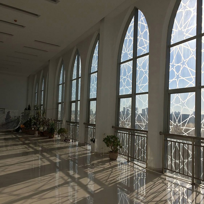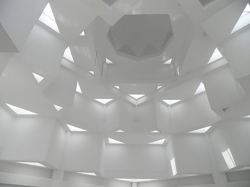 沿西北角三段式大臺階而上,可到達清真寺最重要部分的禮拜殿,也是建筑設計的“點睛”之筆:禮拜殿和穹頂?shù)脑O計,運用了同構原理,將伊斯蘭紋樣進行分解、變化后,生成新的幾何形體,每一層退臺與建筑形體旋轉相結合,產(chǎn)生更多、更豐富的三角形平面組合,利用這些組合,為禮拜殿上空設計了“逐層退臺”的三角形采光窗。給禮拜殿帶來了豐富的自然光源。同時,一天內的光束變化,也將人引向一個深邃的、神圣的、崇高的精神空間。