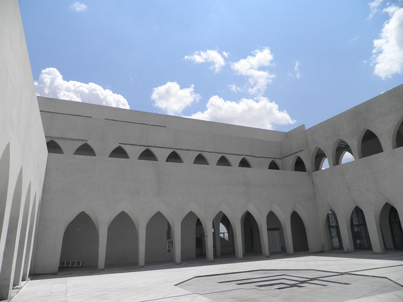 與禮拜殿相連的雙層環(huán)廊設計,通過一系列的拱形門柱,將庭院緊密環(huán)抱。門柱的拱形在延續(xù)13-15世紀建筑風格的基礎上,又加以了創(chuàng)新,門拱如扭曲的柳葉,形成自然曲面,朝向庭院。潔白的環(huán)廊與麻石地面,所構成的機理對比,給人以莊嚴、樸實的印象。37m高的宣禮塔同樣采用運用了同構原理,將鋼結構三棱柱體以幾何關系層層遞減,塔頂?shù)膶毱亢驮卵佬窝b飾物,與禮拜殿穹頂上的標志遙相呼應,構成伊斯蘭教"彎月涵星"象征。