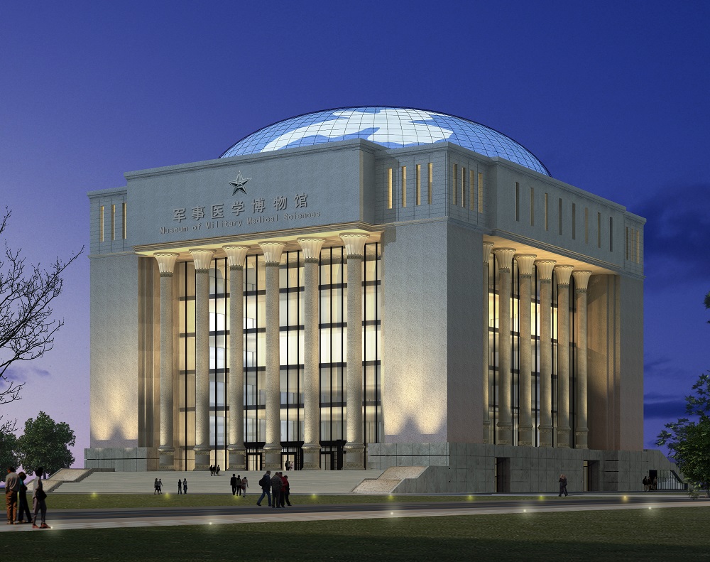中國(guó)人民解放軍軍事醫(yī)學(xué)博物館位于北京市海淀區(qū)太平路,軍事醫(yī)學(xué)研究院內(nèi)西南角,是一座國(guó)家級(jí)大型軍事醫(yī)學(xué)類(lèi)博物館。建筑用地0.873公頃,總建筑面積38000平方米。主體建筑方正,頂部圓形玻璃穹頂直徑47米,表達(dá)了天圓地方的中國(guó)文化理念。穹頂玻璃幕結(jié)合太陽(yáng)能技術(shù),部分太陽(yáng)能反射板組成和平鴿圖案,寓意世界和平,表達(dá)了設(shè)計(jì)的主題。