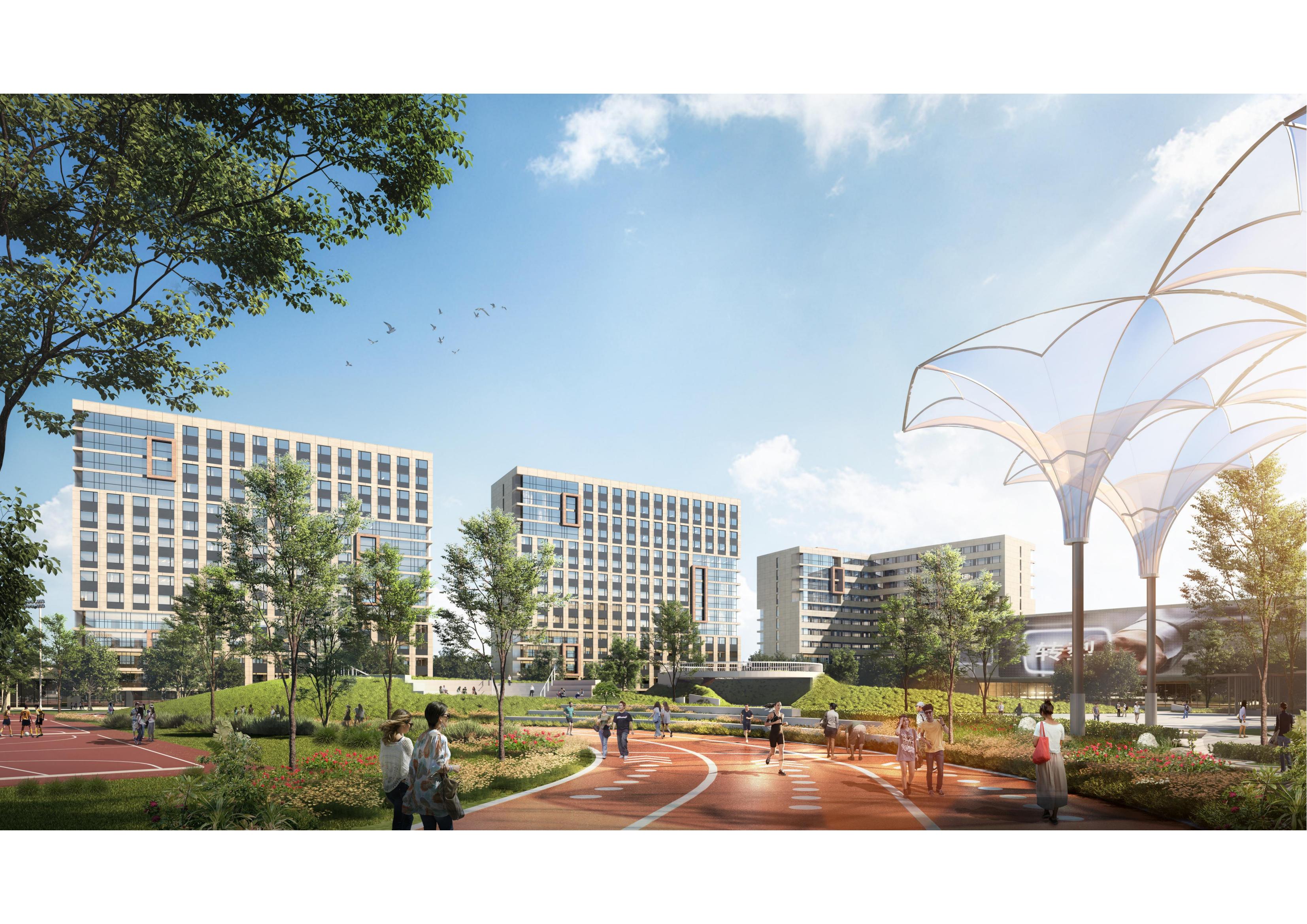 項(xiàng)目總占地426.83畝,以“自成一城”的氣勢(shì)跳出了現(xiàn)有格局。在前期規(guī)劃設(shè)計(jì)中,我們借鑒了《周禮·考工記》中“匠人營(yíng)國(guó),方九里,旁三門(mén)。國(guó)中九經(jīng)九緯,經(jīng)涂九軌?!焙汀澳蠄@北苑,前朝后市”的中國(guó)傳統(tǒng)城市營(yíng)造手法,同時(shí)融入本土中原文化符號(hào),引古論今,從城市層面打造屬于棗莊的“花園校園”。